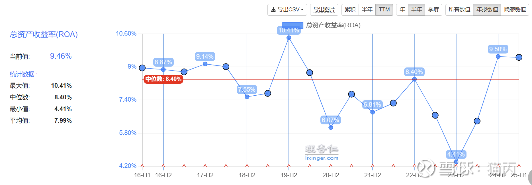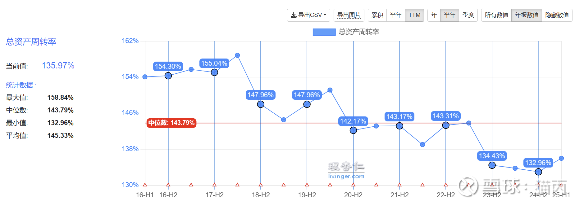 总资产收益率中位数8%左右,尚可。在净利率比较低(7%)的情况下,能达到15%以上的净资产收益率,经以上分析可知是比较高的资产周转率和杠杆率(40%以上)贡献的。