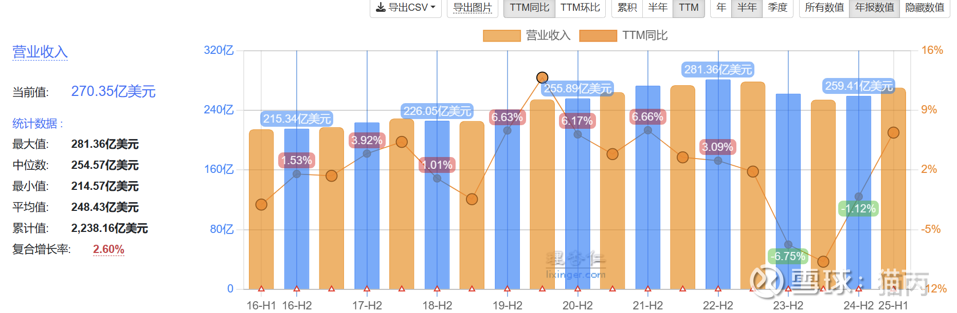 毛利平稳,可见主业的业务风控做的不错,虽然处于周期行业,但是经营结果显示万洲国际在通过业务布局尽量平滑周期风险。(见万洲国际的业务模式一文)近10年营收和毛利的复合增长率在2%以上,是个比较成熟的企业了。