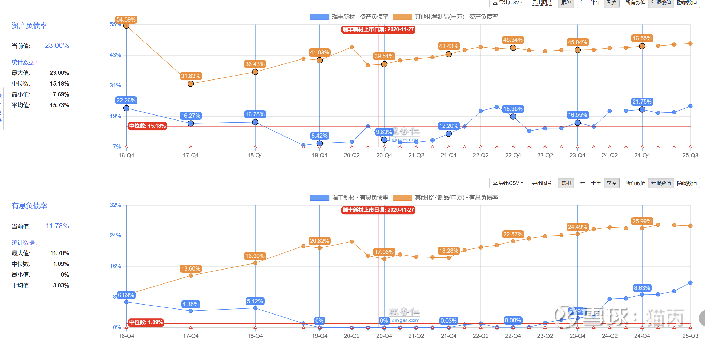 资产负债率中位数15%,目前23%,有息负债率23年开始有增长,当前约12%。