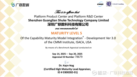 $广联科技控股(02531)$ 近日,深圳广联数科科技有限公司(以下简称“广联数科”)正式通过国际软件工程领域最高级别的CMMI五级认证,标志着公司在软件开发、项目管理、过程改进和产品交付等方面均已接轨国际顶尖标准,跻身全球一流研发企业行列。