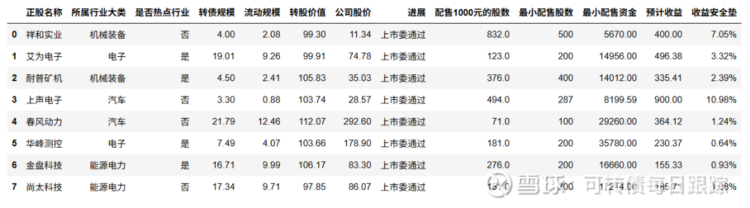 上表是申请过可转债,且已经通过所有审核的公司名单,接下来随时都可以发布可转债配售和申购信息。上表中的流动规模已考虑减持人员的股份占比(上表中跟踪的减持信息是指有具体减持操作的股东,只发布减持公告的股东减持信息并没有包含)