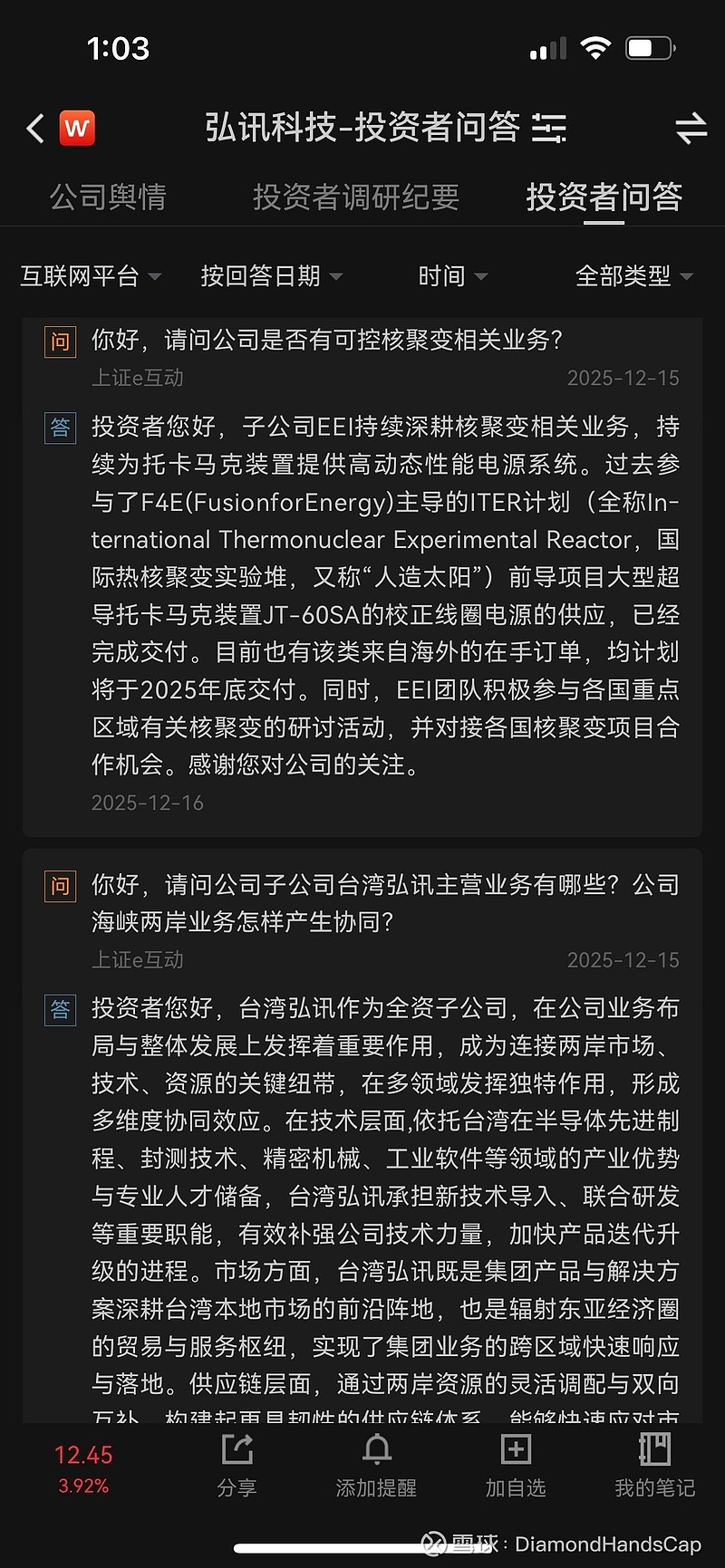 近日特总带货核聚变,今日该板块多只个股涨停。同时今日海峡两岸板块集体上攻,弘讯科技是正宗海峡两岸+可控核聚变,台湾弘讯作为连接海峡两岸的纽带,为公司创造重大协同作用,核聚变子公司已有海外订单,并将于今年完成交付。弘讯科技当前还在低位,作为正宗海峡两岸+可控核聚变,补涨空间巨大!
