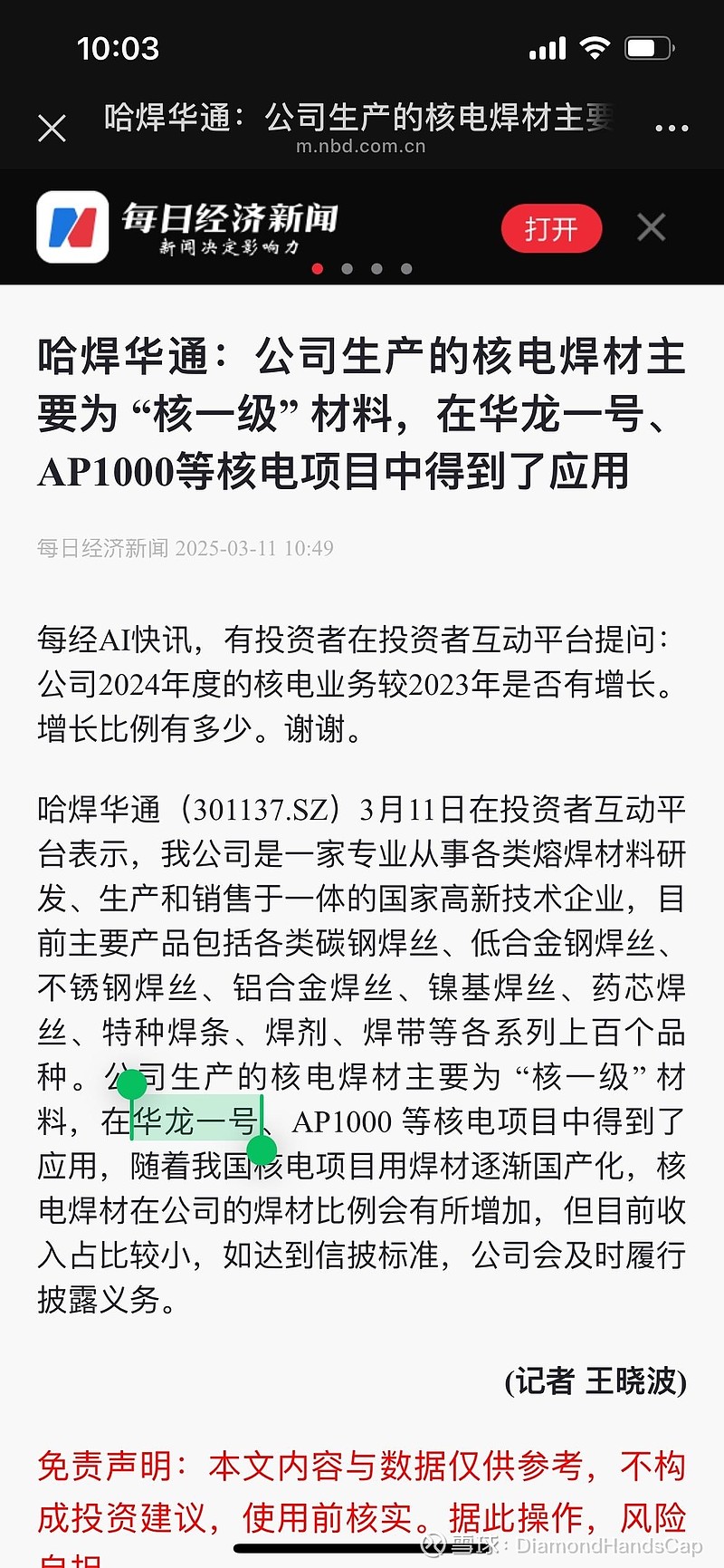 今日新闻联播重点介绍华龙一号核电站项目批量化建设进入加速阶段。哈焊华通是华龙一号核一级材料供应商,是核电产业中最核心、要求最高的。此外,哈焊华通产品还广泛应用于包括国和一号等国家重点核电机组。