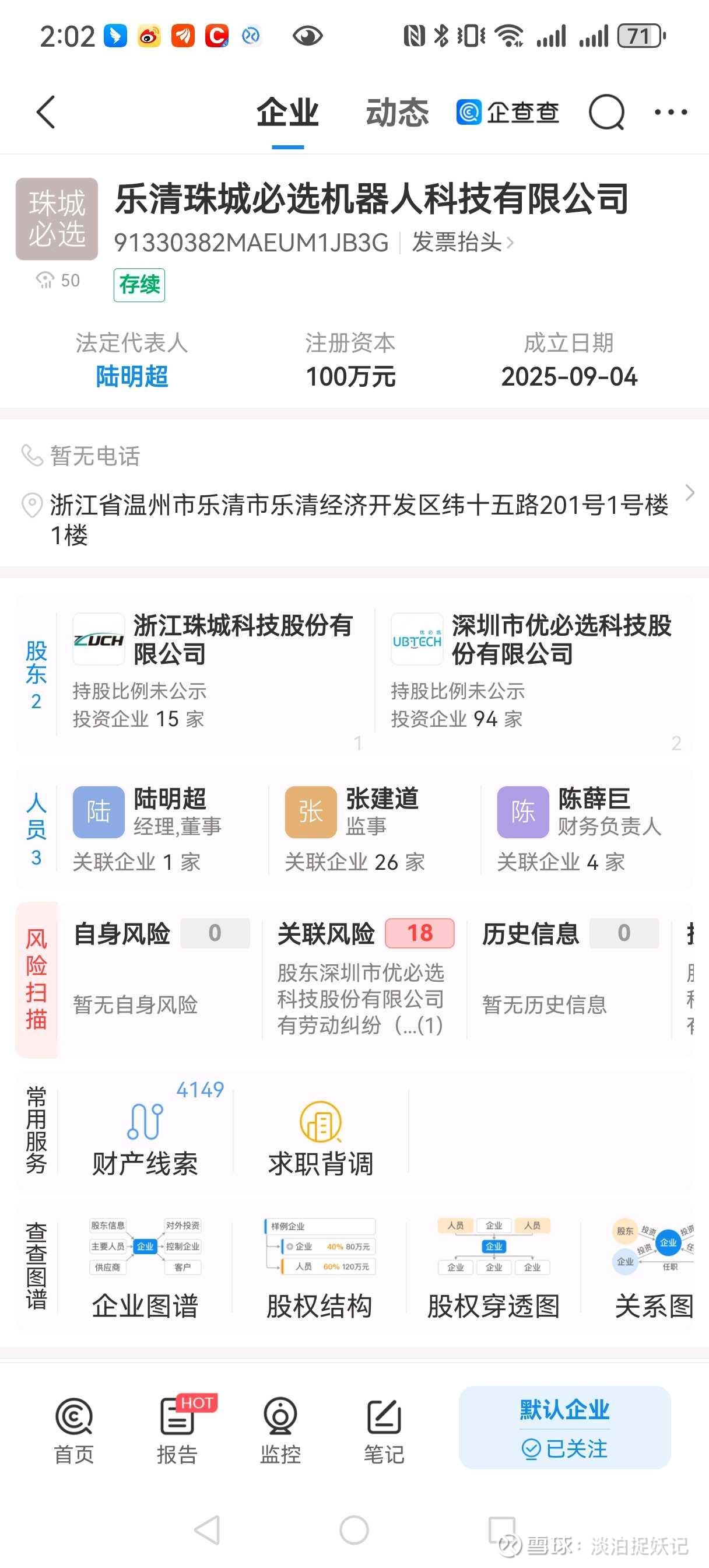 人民财讯9月4日电,企查查APP显示,近日,乐清珠城必选机器人科技有限公司成立,法定代表人为陆明超,经营范围包含:智能机器人的研发;服务消费机器人制造;人工智能基础资源与技术平台;人工智能应用软件开发等。企查查股权穿透显示,该公司由珠城科技、优必选共同持股。