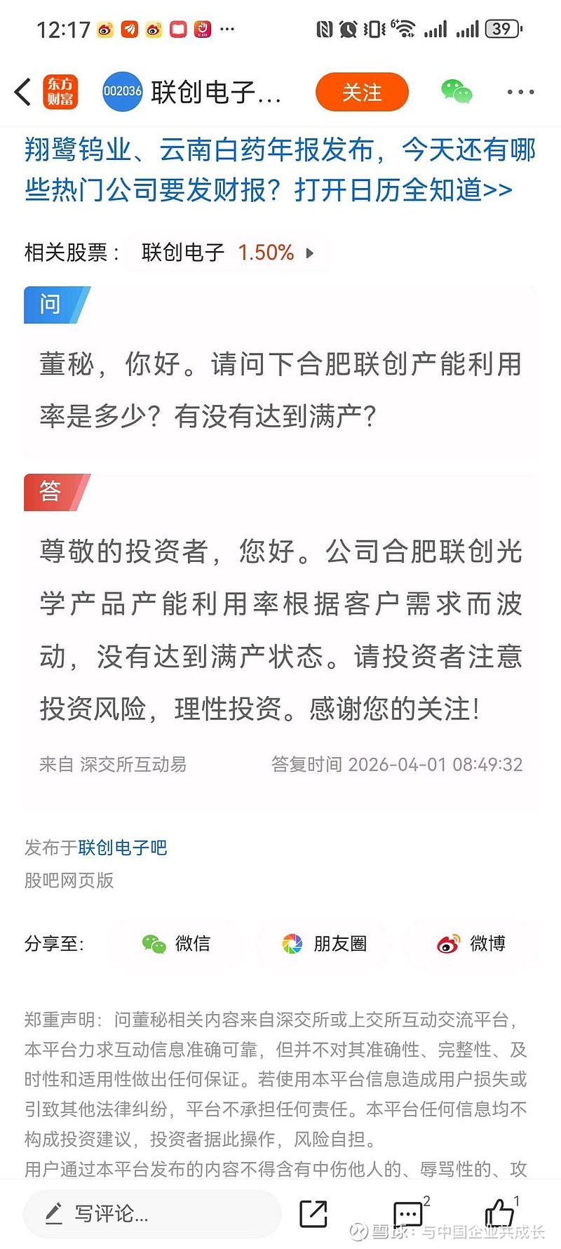 这董秘就想散户抛弃筹码吧?你说产能利用率,好歹说详细点,分成模组和镜头吧?之前报道合肥产能100亿,要是满产,联创股价涨上天了!