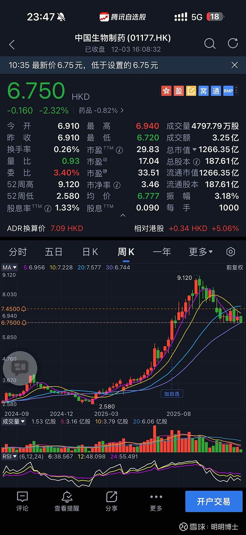 $中国生物制药(01177)$ MACD指标(日线):DIFF=-0.006、DEA=-0.004,MACD=-0.004(绿柱),说明短期空头占优,未出现“金叉”或“绿柱缩短”的反转信号。RSI指标(强弱分界):日线RSI(6/12/24):29.44/37.98/42.24(均<50,处于弱势区域,未达超卖阈值30以下);周线RSI:38.57/48.10/55.49(刚过中性线50,但仍偏弱势)。两者均提示短期无强烈反弹需求,仅可能存在“弱反抽”。