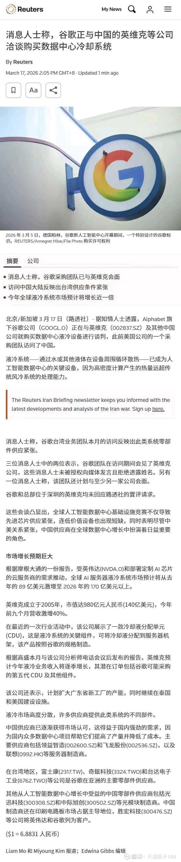 液冷系统作为人工智数据中心的核心配套设备,通过液体循环替代传统风冷实现高效散热,其性能直接决定了高密度计算设备的运行效率。随着全球 AI 算力需求的爆发式增长,数据中心散热需求远超传统风冷系统的处理能力,而核心零部件的产能瓶颈,成为了谷歌等科技巨头供应链布局的关键痛点,此前谷歌,亚马逊等北美头部CSP客户的主要液冷供应商是台湾的AVC,台达电等厂商,但几乎产能都被英伟达生态预定,无法分出新的产能配合AISC机型的液冷需求。