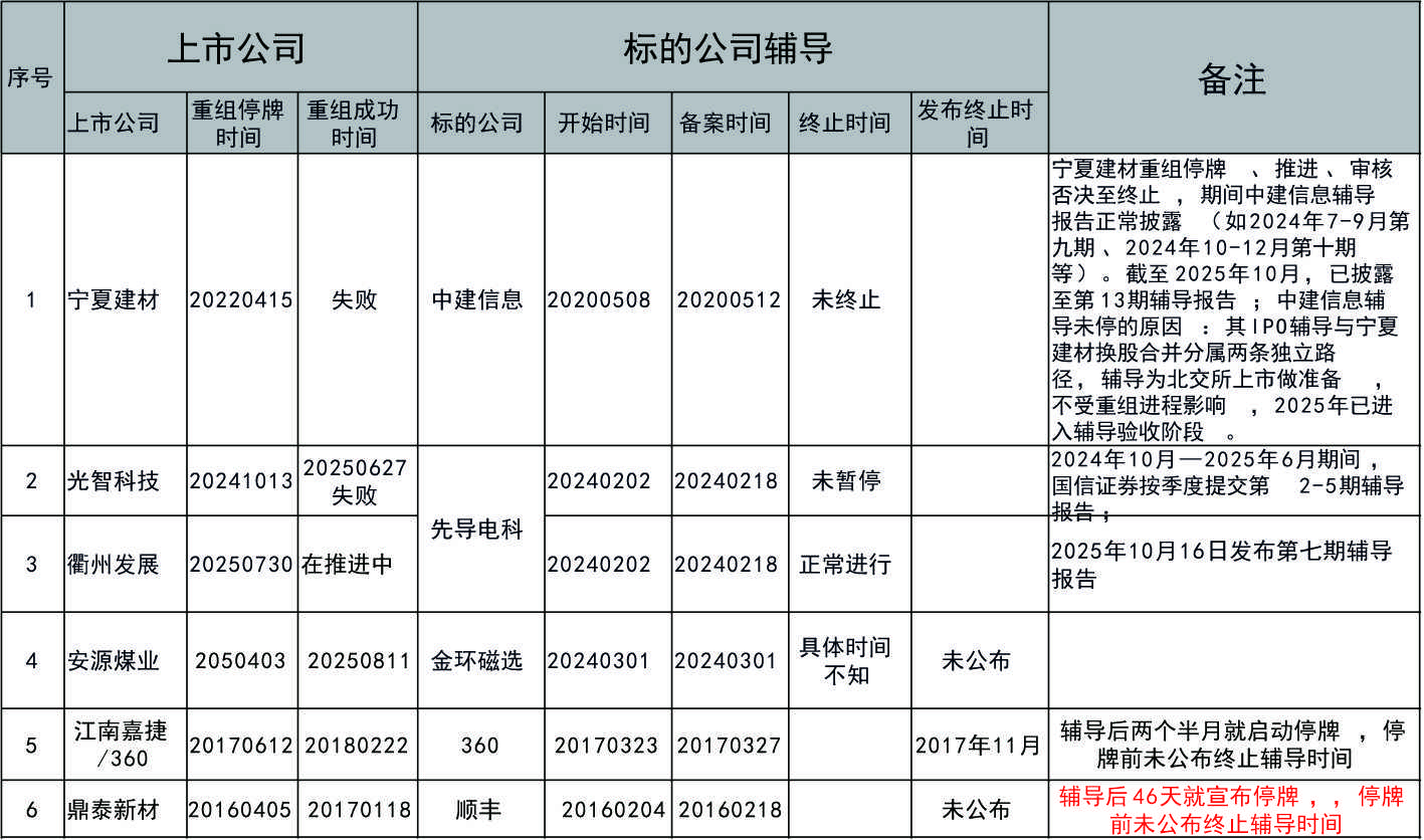 结论先行: 1、重组推进和IPO是两条线,没有冲突,可以同时推进。并且在重组推进当中,辅导不会停。因为万一重组失败,IPO还可以正常推进。 特别是下表的序号2-3的先导电科,重组了2次,辅导都没停。第二次重组还没确定是否成功,所以到2025年10月16日还正常发布第七期辅导报告,下一次发布报告时间是26年1月 导向:重组可以随时推进,辅导也不会停。只有到重组成功,辅导可以自动终止。 2、辅导终止有很多种,有的是确定确实不行,主动终止。有的是每季度下个月没有发上一季度的辅导进度报告,自动终止。 导向:很多时候,没有辅导终止公告,就直接停牌,因为辅导本来就没停,万一重组不成,后续还要IPO。如顺丰,并且顺丰是在辅导备案后的46天后停牌。
