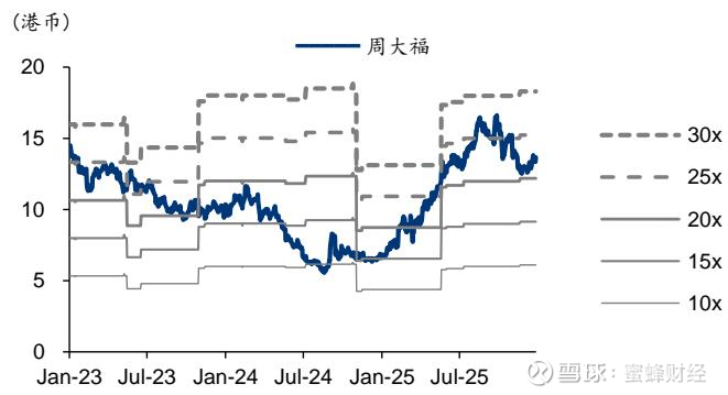 图1:周大福2023-2025年股价及估值区间走势(10-30倍PE区间)【数据来源:华泰证券】