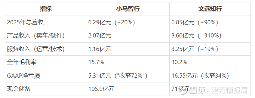 简单来讲,文远是"先卖车"的生意,产品收入+310%,财报好看,确定性高。小马是"先跑路"的生意,单车经济已在广深达到盈亏平衡,但规模化时间表不明,市场等不起。