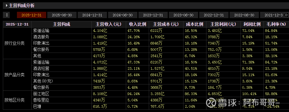 主要收入来源是索道收入,毛利率84%占利润比例72%。这个索道业务就是印钞机,业务简单易懂,变化因素就是客流量。云南是旅游大省,所以该业务现金流能够很稳定,同时公司的分红也很稳定,周一买入价格股息率达到了4%。