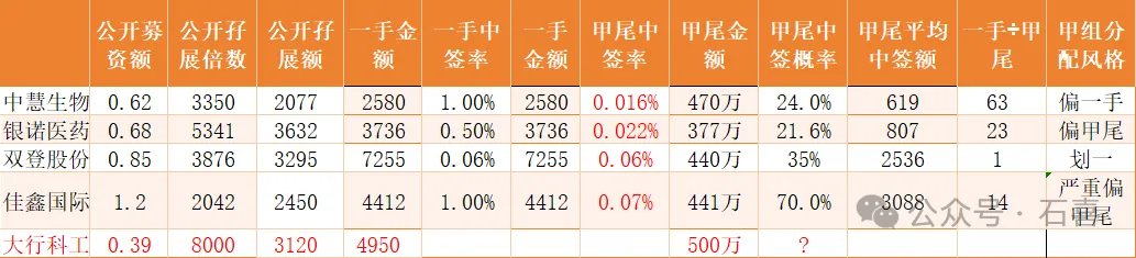 银诺医药的甲组分配风格略偏甲尾,乙头分配风格正常,我就拿银诺医药来对比,以预测大行科工的中签率。