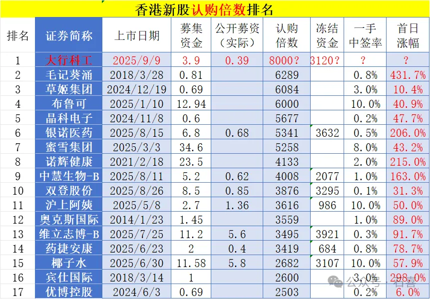 按照目前的孖展情况,结合同样是选择B机制10%公开发行的几倍前辈(银诺医药、双登股份)的孖展表现,我预测我认为大行科工最终至少能达到8000倍,超越了霸榜长达7年的毛记葵涌,屈居港股新股认购倍数排名第一。
