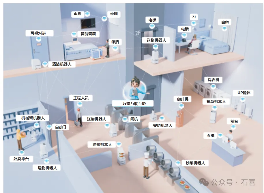 机器人进入电梯后,前往指定楼层,再导航至宾客房间,完成送物任务。最后,通信系统会向宾客的设备发送确认信息,确保实现端到端的服务透明度。