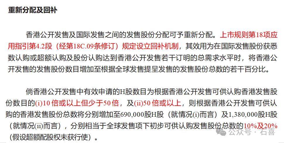 简单说就是:初始公开发行5%,孖展倍数10-50倍回拨至10%,孖展倍数超过50倍回拨至20%。所以,这个回拨机制不是公司主动选择的,是规定就应该这样。