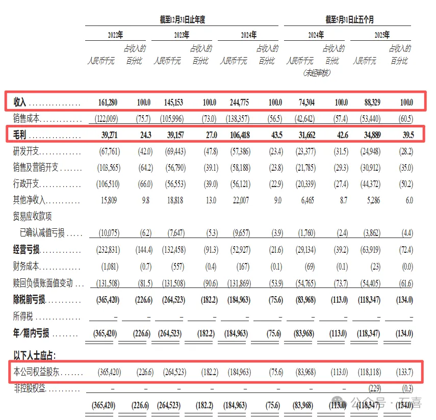 毛利分别约为人民币0.4亿元、0.4亿元、1.1亿元、0.3亿元及0.3亿元,2022-2024年复合增长率为64.62%;