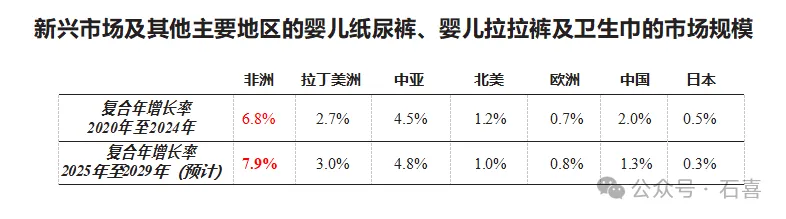 从上表中可以看出,未来几年,在婴儿纸尿裤市场和卫生巾市场,非洲市场的增长最快。