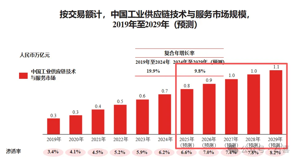 从行业增长空间上看,2024 年中国工业供应链技术与服务市场规模以交易额计算为人民币0.7万亿元,预计到2029 年将达到人民币1.1万亿元,复合年增长率为9.8%。