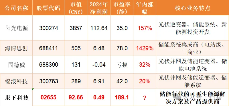 海博思创是公司在招股说明书里点名的同业公司,二者核心业务均聚焦储能系统,海博思创的储能系统涵盖功率型、能量型等多种类型,应用场景覆盖火电机组联合调频、可再生能源并网等,和果下科技的大型储能、工商业储能业务场景高度重叠,是直接的行业对标竞争者。