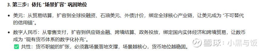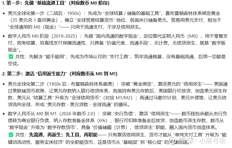 完全一模一样的过程.不要低估了我们人民币国际化的决心,要搞清楚当下大漂亮是靠的什么,这是我们反美元霸权的重要的过程.我们要用数字人民币的m0-m1的过程去重走美元的全球化的路.第一步在国内搭建应用生态,第二步就是走出去全球化的过程.可以让各国都用上数字化人民币能找到对应的应用场景.这是人民币星辰大海的第一步,是数字人民币国际化的0-1的时刻.