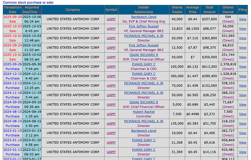 $美国锑(UAMY)$ 其实我之所以挺喜欢这家公司,除了它的业务这些不谈,我觉得管理层给人的感觉是挺不错的。内部人士从22年开始就一直在购买。直到今年9月底,CEO还以6.13的价格又买了10万股。虽然10月份大涨一把的时候,几个VP和Director有减持,但CEO仍然没动。虽然内部人士增持或减持不一定真能说明什么太大问题,但至少增持说明他对自己长期还是有信心的(当然这信心能不能变成业绩,能不能让股价也不好讲)。所以,还是那句话讲的,一下涨多了,风险就来了;但跌多了,机会也就来了。