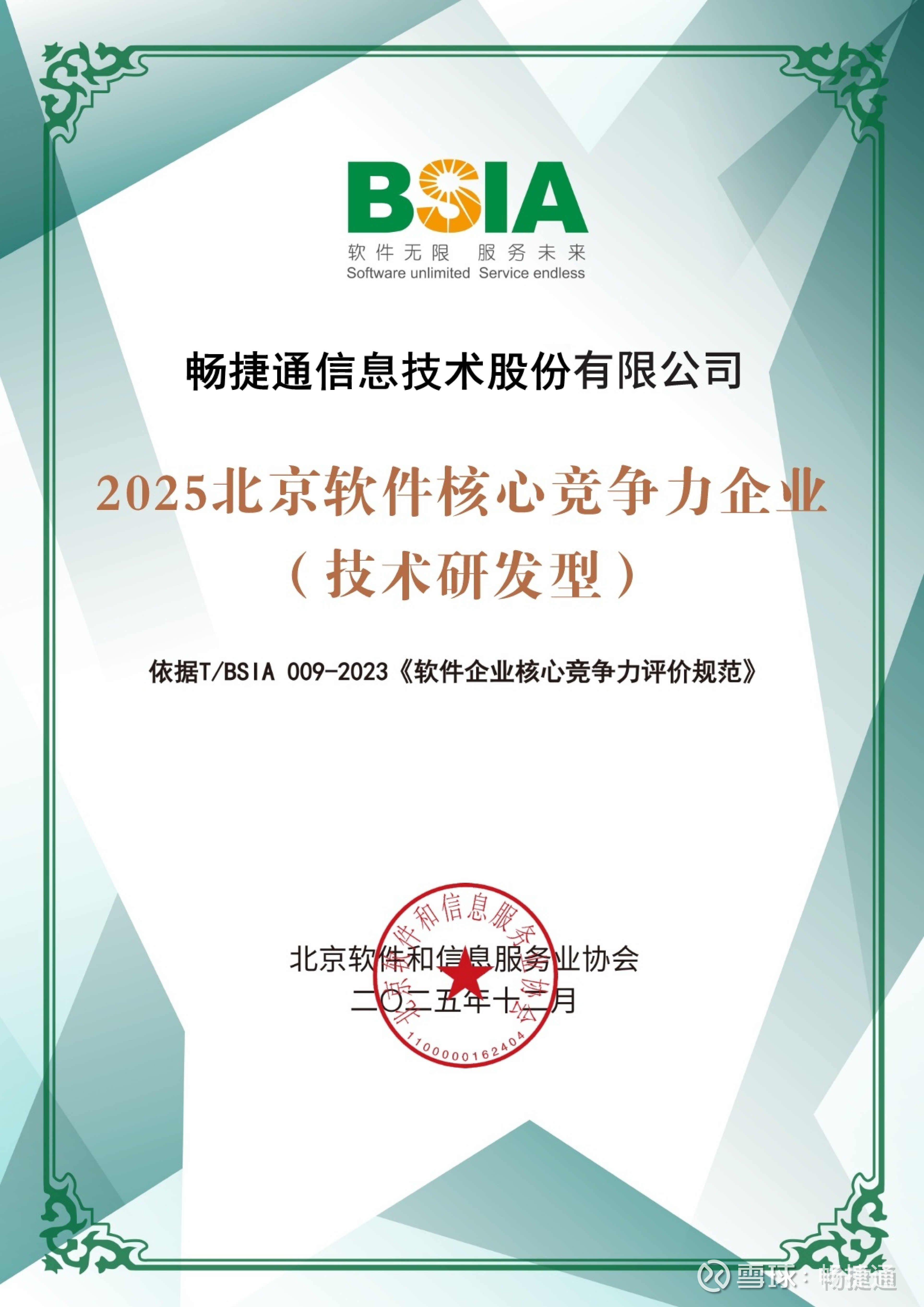 在报告发布的“2025北京软件企业核心竞争力企业”名单中,畅捷通信息技术股份有限公司凭借深厚的技术研发实力与持续创新能力,成功入选“技术研发型”企业榜单。