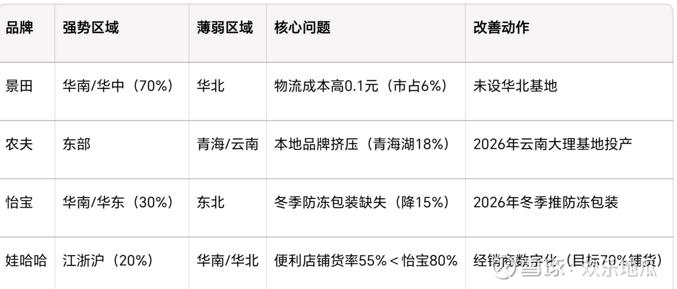 2. 怡宝:国内下沉渗透(新增5万网点),中端5%→8%份额(2026),海外弱但国内基本盘稳;