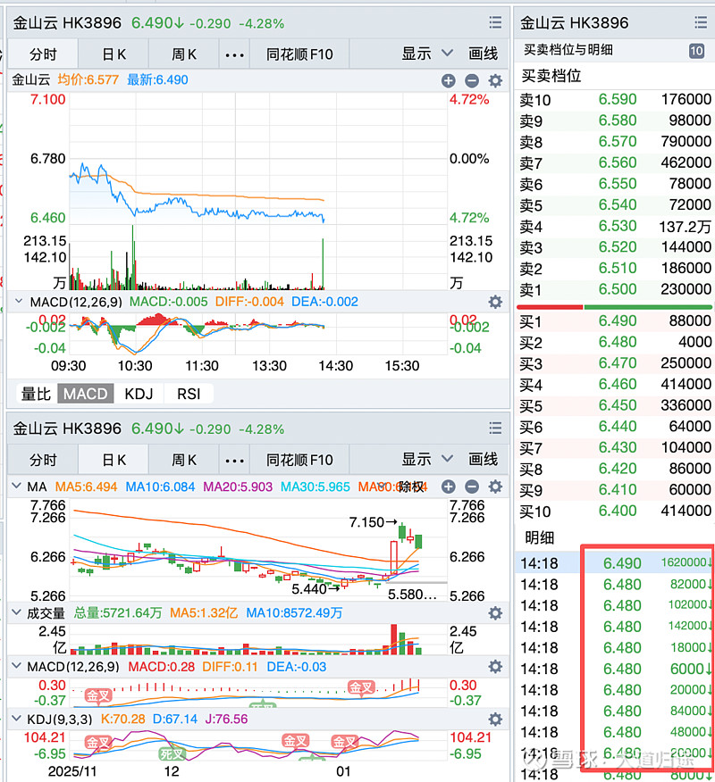 $金山云(03896)$ 今天下午这个大单砸的好干脆啊,接近223.60万股直接就嘎嘣脆了原本按照走势应该是要突破了,可惜了!一旦突破7.61,那么这个“U型”技术就算是走出来了,那个时候也是盈利概率远大于风险的时候,加油。