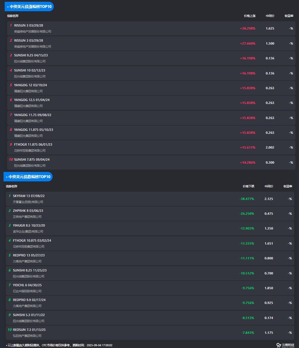 9月4日,中资美元债涨跌幅榜TOP10如下: