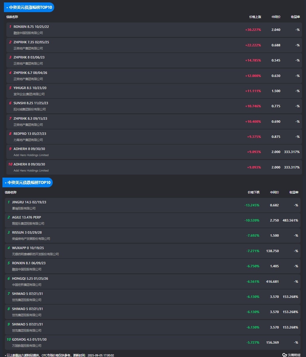 9月5日,中资美元债涨跌幅榜TOP10如下: