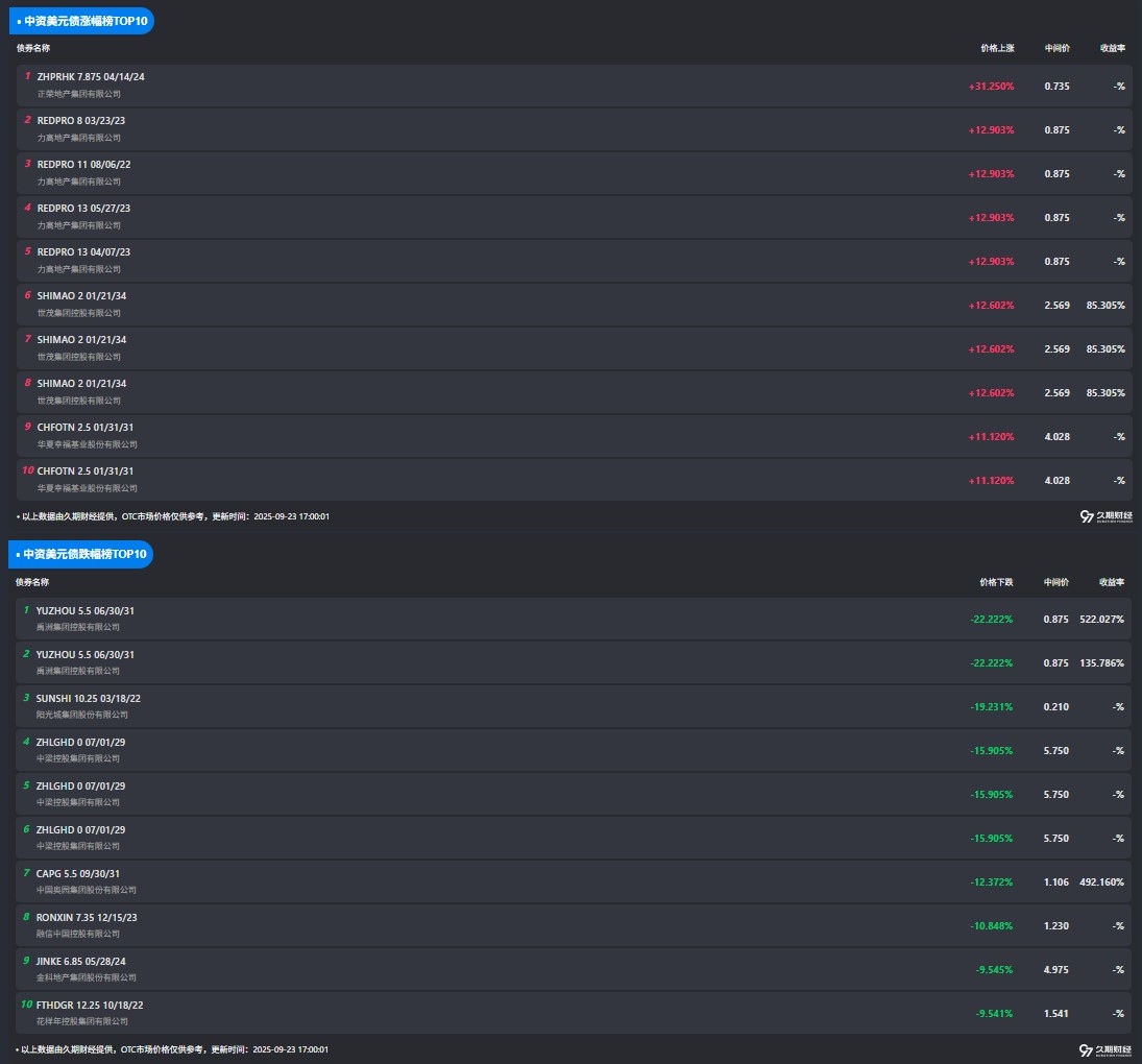 9月23日,中资美元债涨跌幅榜TOP10如下: