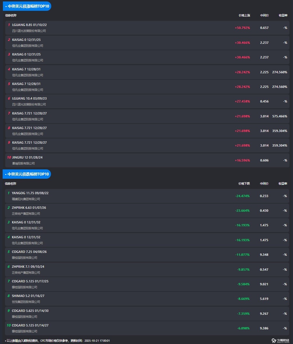 10月21日,中资美元债涨跌幅榜TOP10如下: