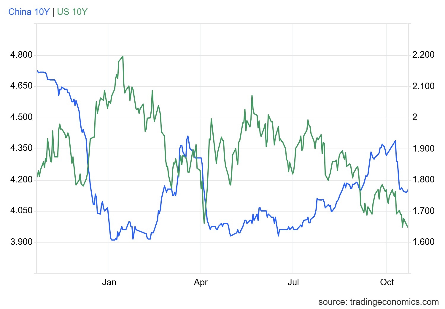 截至10月20日,中国二年期国债收益率为1.50%,中国十年期国债收益率为1.85%。