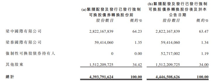 于2025年12月29日,本金金额为5,406,872美元的强制可换股债券(占初始发行金额的50%)已根据规定强制转换为52,717,002股强制可换股债券转换股份(「已发行强制可换股债券转换股份」),转换价格为每股0.8港元,并按协定汇率每1美元兑换7.8港元计算。