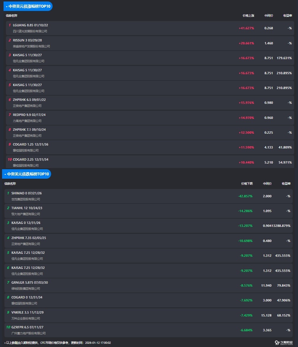 1月12日,中资美元债涨跌幅榜TOP10如下: