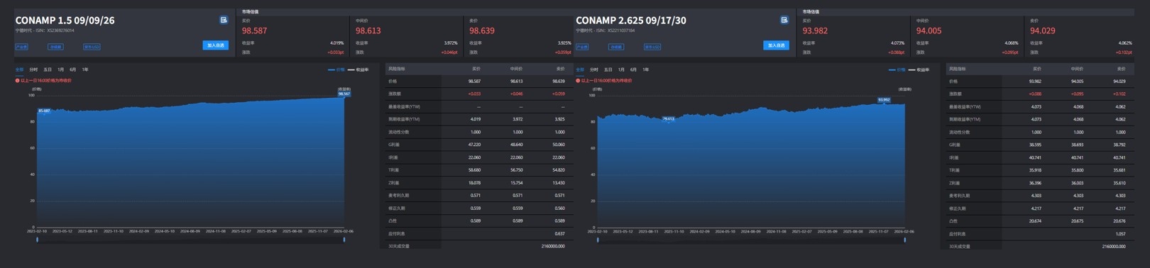 宁德时代(03750.HK)发布公告,公司完成发行50亿元绿色科技创新债券,募集资金已于2026年2月9日到账。同时,公司拟发行不超50亿元科技创新公司债券,票面利率询价区间为1.60%-2.20%。相关美元债: