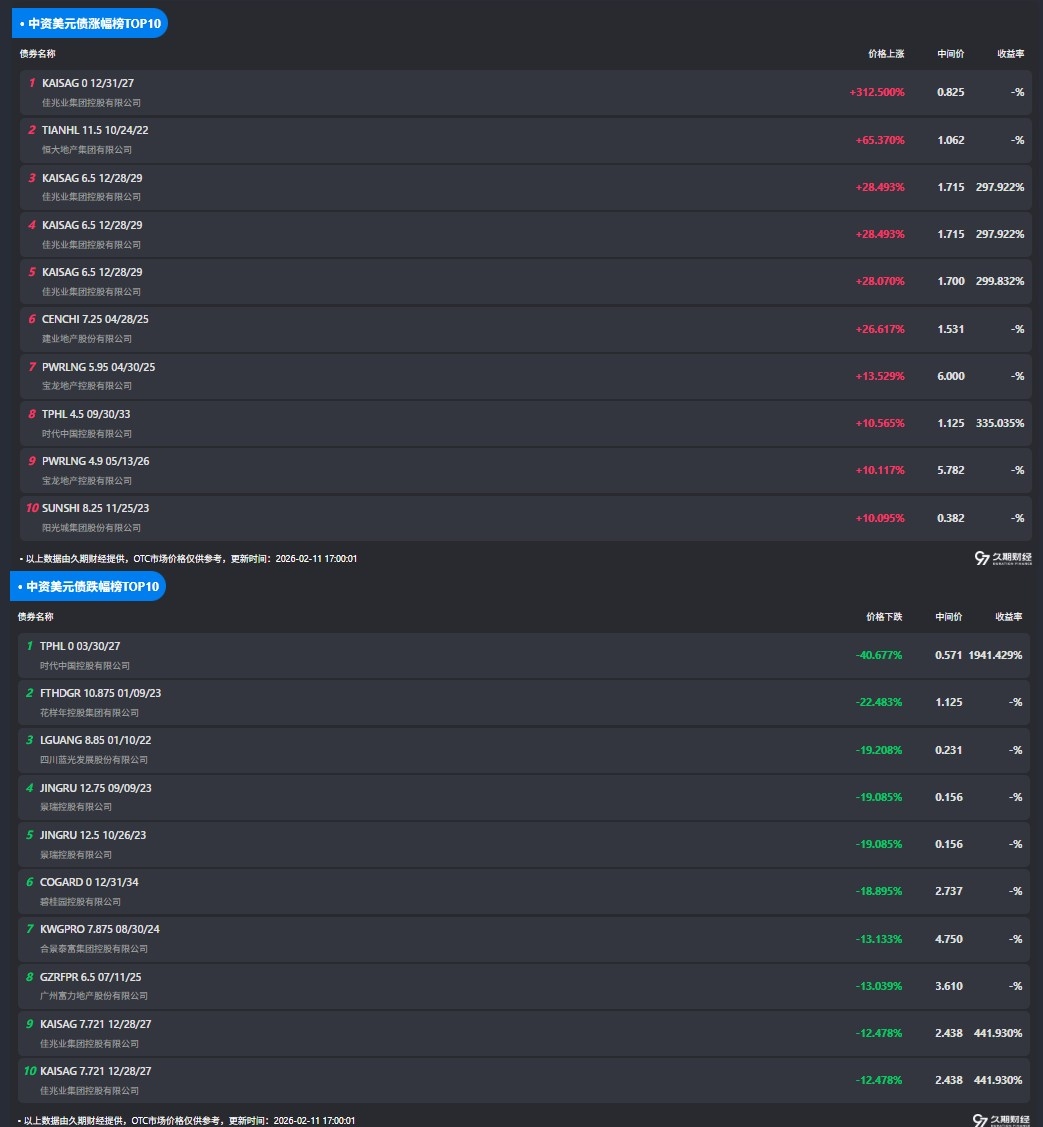 2月11日,中资美元债涨跌幅榜TOP10如下: