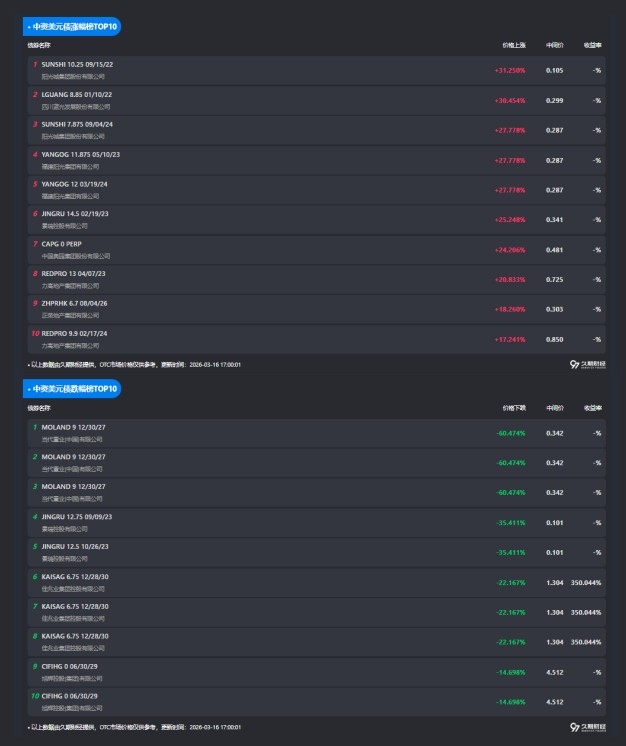 3月16日,中资美元债涨跌幅榜TOP10如下: