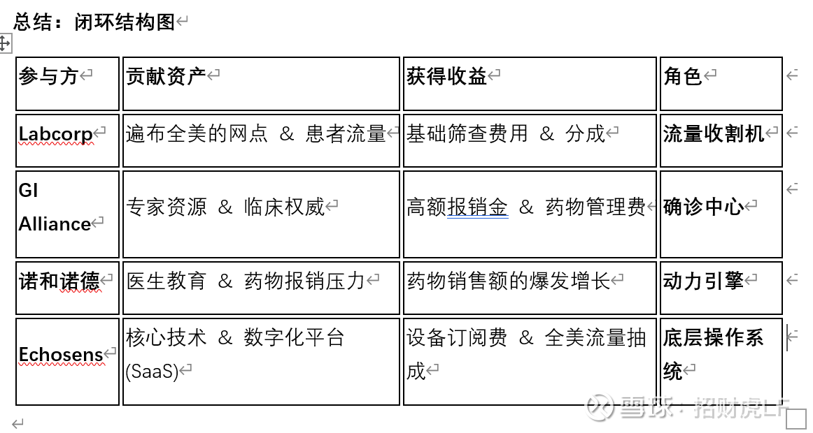 Echosens(设备供应商)、Labcorp (社区诊所)、GI Alliance(专科医院集团)、诺和诺德(药企)以及保险公司(Payers)已经形成了一个极其稳固的“商业逻辑闭环”。