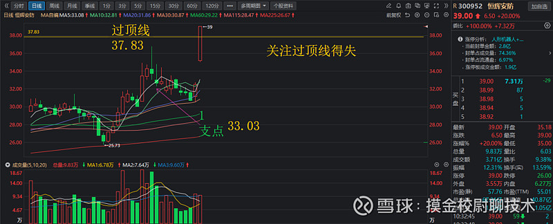 今天纯属跳空高开偷袭,直接就越过了过顶线37.83,先看下能不能守住,守住就是上行。