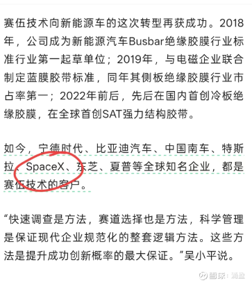 紧接着在《瞭望东方周刊》也爆出SpaceX是赛伍技术客户,关于SpaceX,已经是实锤了。无需再质疑。