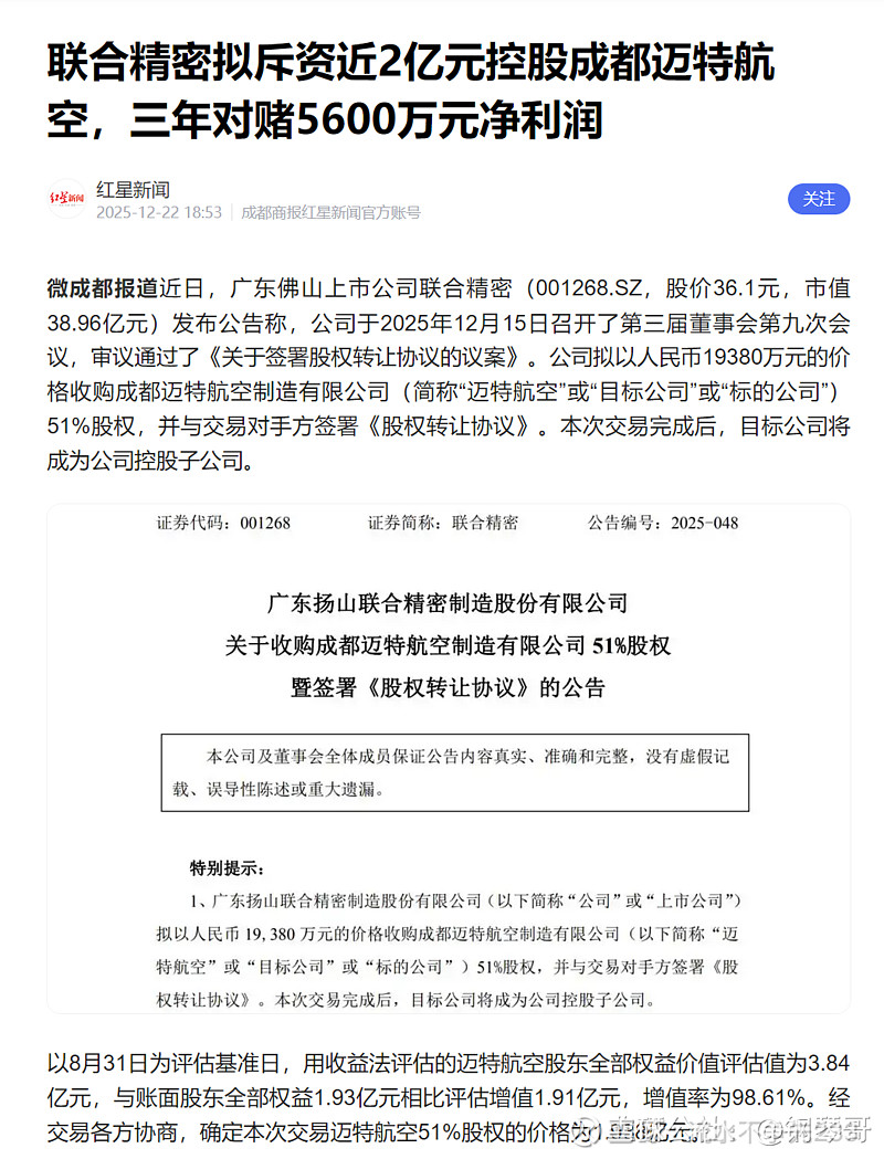 $联合精密(SZ001268)$ 小号的超捷 2亿元收购迈特航空 迈特航空是航天一院、蓝箭&天兵核心供应商 目前还没有商业航天概念 股价今天被错杀
