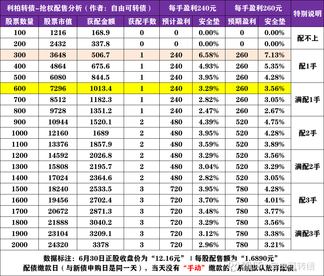 10张配债计算公式 股票数量:6100/1.6890=355股 获配金额:3001.6890=506元 获配金额:6001.6890=1013元 公式1:配债张数100/每股配售额=所需股数 公式1:沪市转债只配1手和末置位的最后1手,配债张数都可以只设置为6张而非10张。 公式2:持有股数*每股配售额=获配金额 结论:持有600股“利柏特”的股票,可以获配1手(10张)可转债。