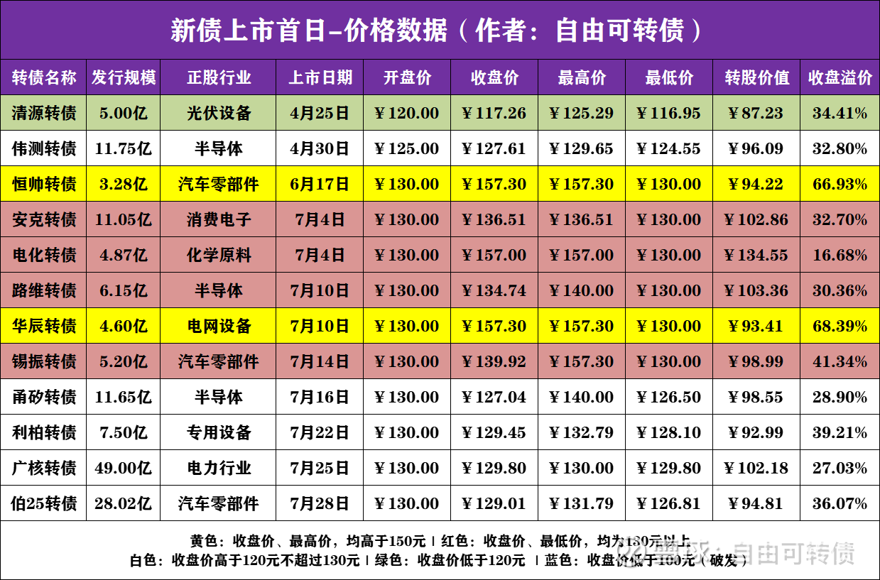 近期上市新债首日价格数据(共12只):达到最高价3只、收盘维持最高价2只、开盘价为130元10只、收盘价130元以上6只。