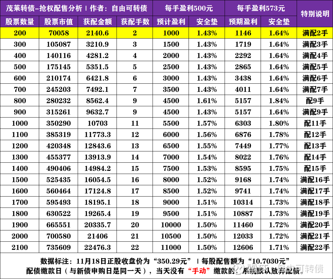 一手党:11月20日当天收盘后持有200股“茂莱光学”的股票,可以获配2手(20张)可转债。配债是股东权利,即使没有开通可转债交易权限,也能够正常参与配债