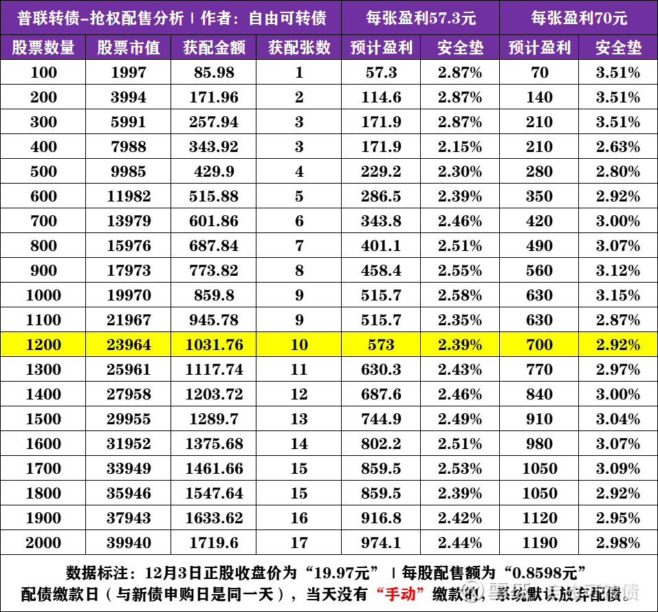 普联转债-配债计算 每股配售额:0.8598元 获配金额:股票数量×每股配售额 安全垫:预期盈利÷股票市值