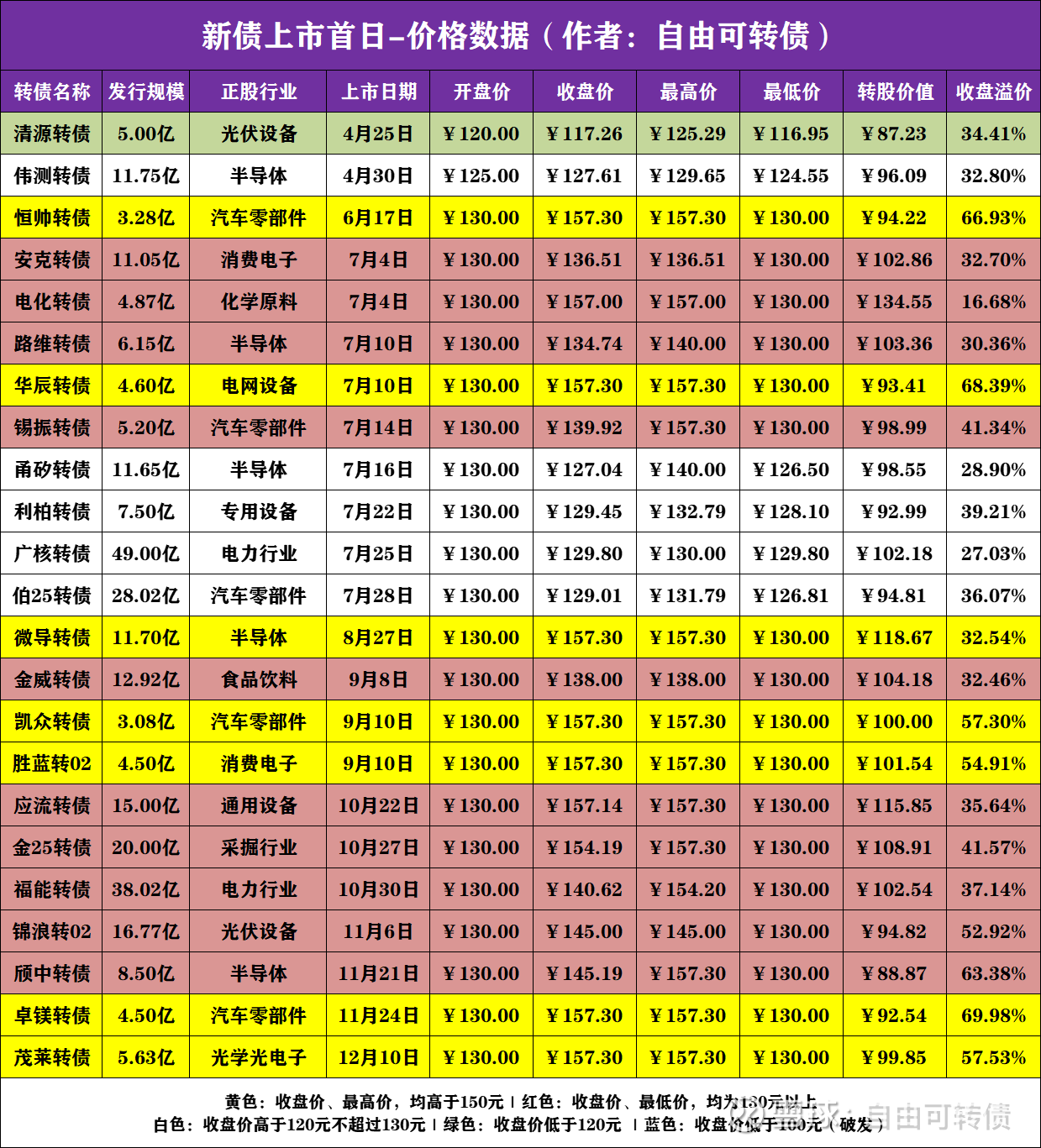 近期上市新债首日价格数据(共23只):达到最高价11只、收盘维持最高价7只、开盘价为130元21只、收盘价130元以上17只。