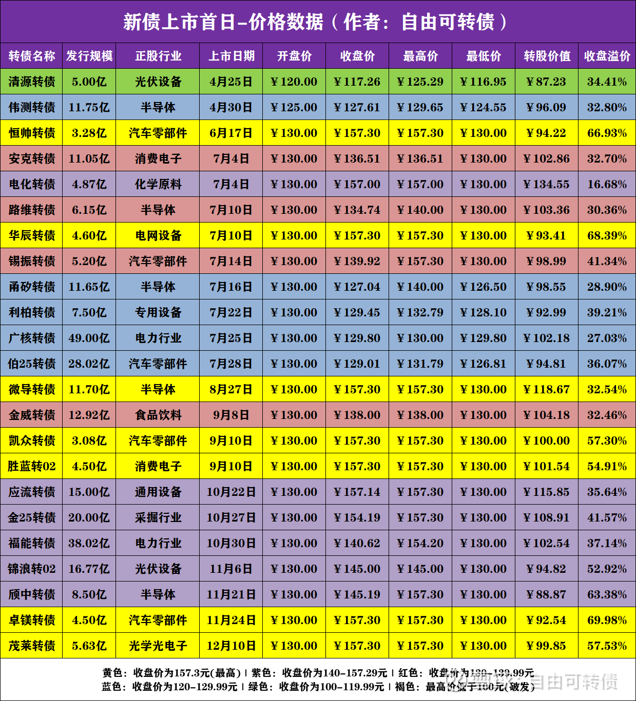 近期上市新债首日价格数据(共23只):收盘时维持在最高价157.3元的共有7只,收盘价为140-157.29元的有6只,今年8月以后上市的新债整体表现都非常棒。