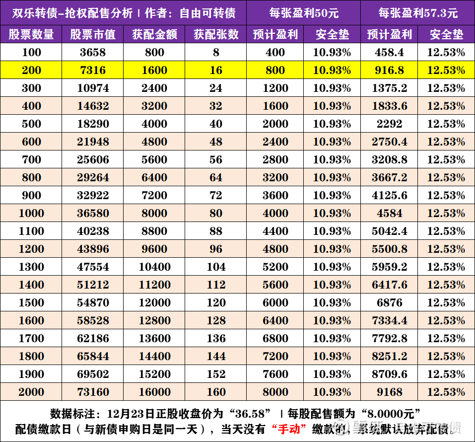 双乐转债-配债计算 每股配售额:8.0000元 获配金额:股票数量×每股配售额 安全垫:预期盈利÷股票市值