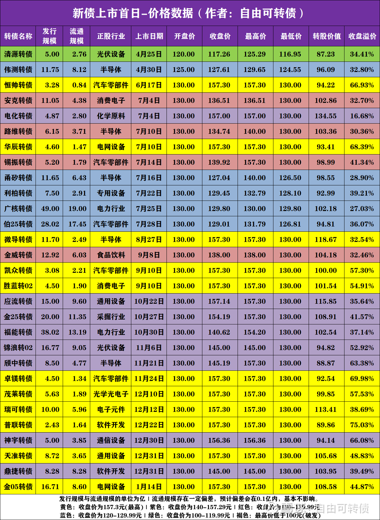 近期上市新债首日价格数据(共29只):收盘时维持在最高价157.3元的共有11只,收盘价为140-157.29元的有8只,2025年8月以后上市的新债整体表现都非常棒。